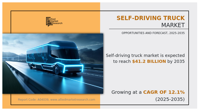 WILMINGTON, NEW CASTLE, DE, UNITED STATES, January 31, 2025 /EINPresswire.com/ -- Allied Market Research published a report, titled, โSelf-Driving Truck Market by component (Hardware, Software, and Services), by application (Logistics & Transportation, Construction and Manufacturing, Mining, Ports and others), by level of automation (Level 1, Level 2, Level 3, Level 4, and Level 5), by propulsion type (Internal Combustion Engine, Hybrid Transmission, Electric Transmission): Global Opportunity Analysis and Industry Forecast, 2025-2035โ.